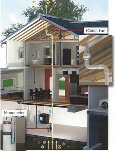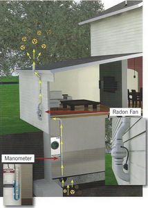 A negative pressure field is created below the building to prevent the entry of radon gas. A penetration is made in the concrete floor (slab), and a small pit is created beneath each penetration. If there is no slab, a radon retardant vapor barrier is affixed over rock and dirt before creating the penetration(s). PVC vent pipe is connected to the penetration(s) and is typically routed unobtrusively to the suction side of the radon mitigation fan. Additionally, PVC vent pipe is then connected to the pressure side of the fan and routed up the sidewall of the house to discharge the radon gas safely above the roof. A weatherproof electrical connection is provided for the fan.