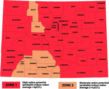 Here is a map of Radon zones from the EPA. Most of Northern Colorado is in Zone 1. Zone 1 counties have a predicted average indoor radon screening level greater than 4 pCi/L (picocuries per liter) (red zones). The south/western part of Colorado is in Zone 2. Zone 2 counties have a predicted average indoor radon screening level between 2 and 4 pCi/L (orange zones).